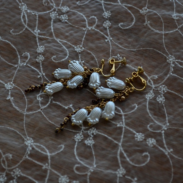 パールカラーのすずらんと真紅のビーズがゴールドのチェーンで繋がってシャラシャラと揺れます。 合間に飾られた深い赤や黒の混ざった小さなビーズは、 可憐に見えるすずらんにも毒のあるという一面を表現。 女性らしさと個性、アンティークな雰囲気が魅力のイヤリングです。 耳に挟む金具は肌に優しいk16kgpメッキ。 変色耐久性を考慮し、肌あたりの優しい鍍金です。 ·············+·············+·············+············· 片耳約3g 飾り部分の長さ約5cm ·············+·············+·············+·············