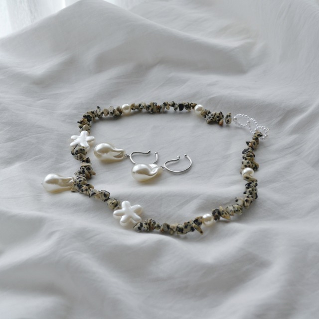 • ダルメシアンジャスパー&バロックパール∷イヤリングとネックレスのセット