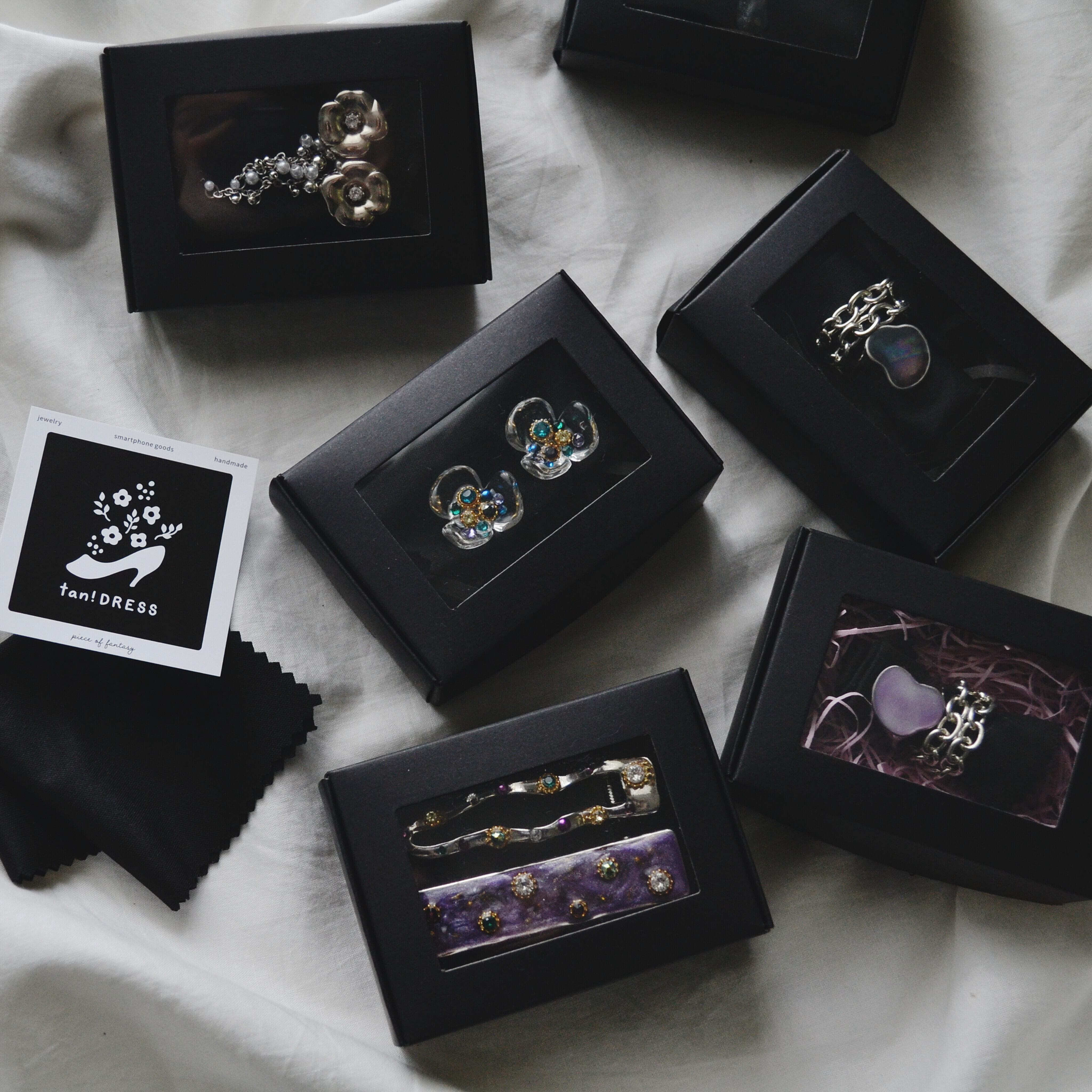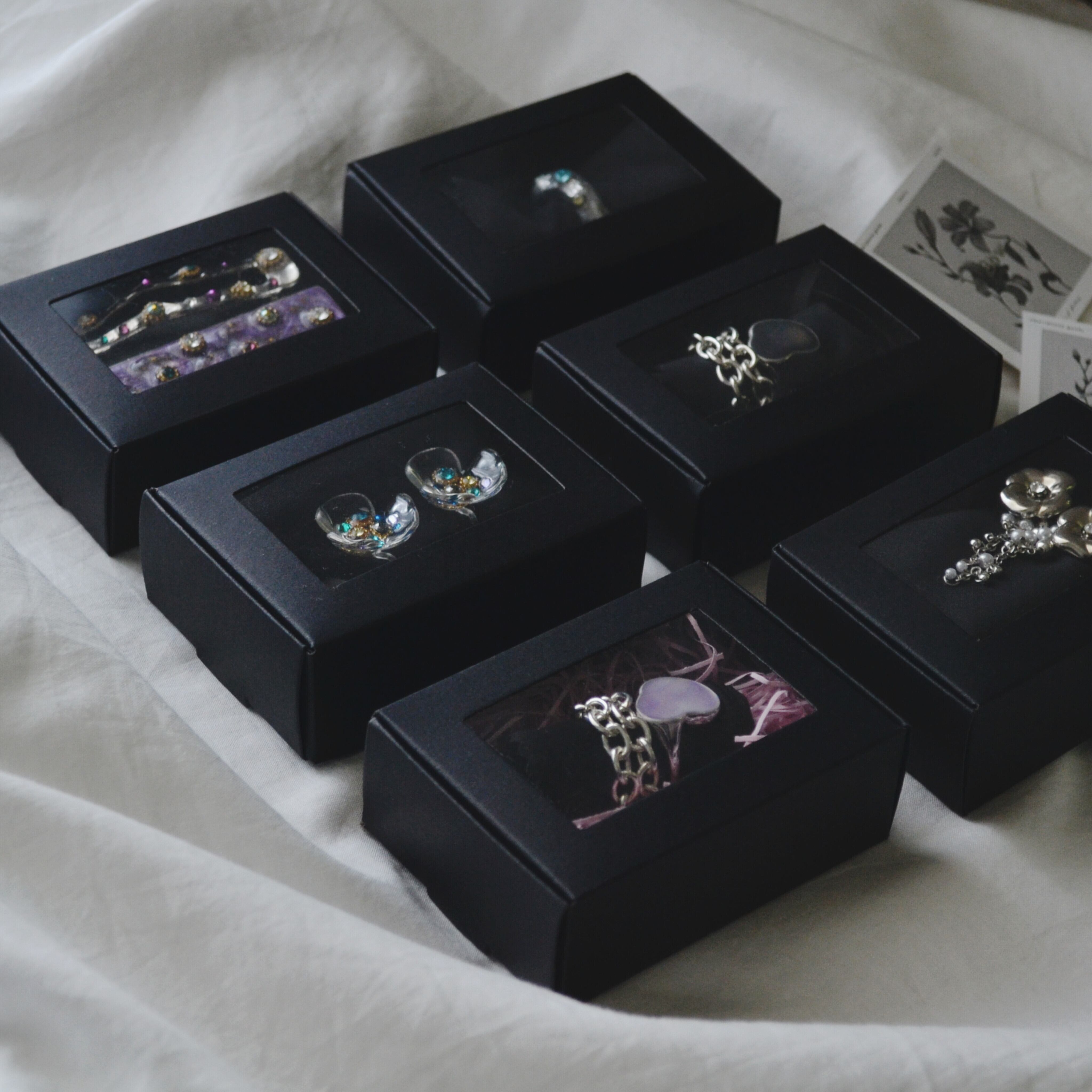 最近は黒髪に似合うアクセサリーをテーマにお作りしているので、黒い箱のギフトボックスをご用意しました。